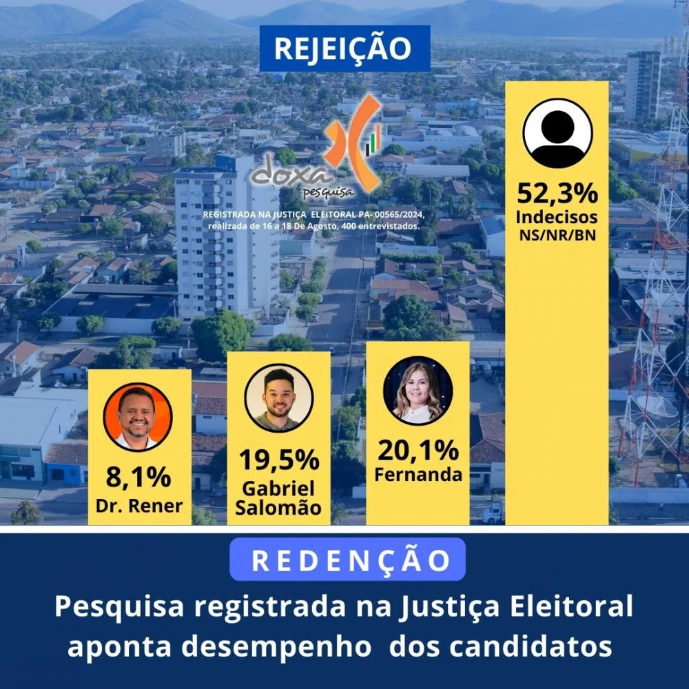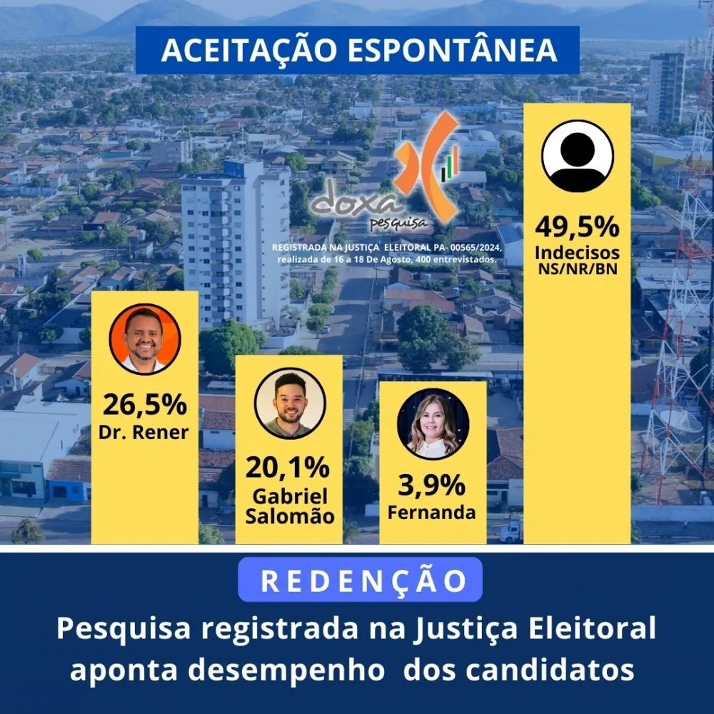 Esta é a nona pesquisa registrada na Justiça Eleitoral sobre as eleições 2024 na cidade de Redenção. Em todas, os candidatos Gabriel Salomão e Dr. Rener, polarizam a competição. De acordo este levantamento estatístico, na modalidade espontânea, se a eleição fosse hoje o odontólogo Dr. Rener, seria o eleito com 26,5% dos votos. O jovem Gabriel Salomão seria o segundo colocado com 20,1% e Fernanda Teodoro seria a menos votada com 3,9%. Os que não responderam, brancos, nulos e indecisos somariam 49,5%.