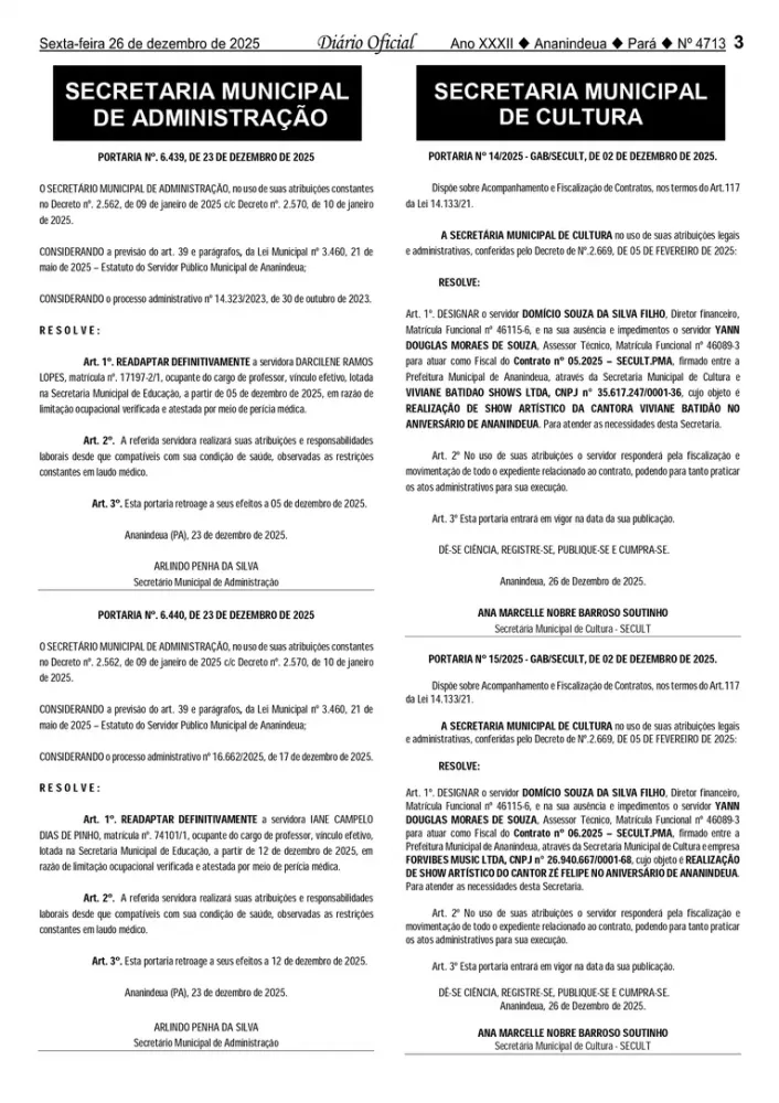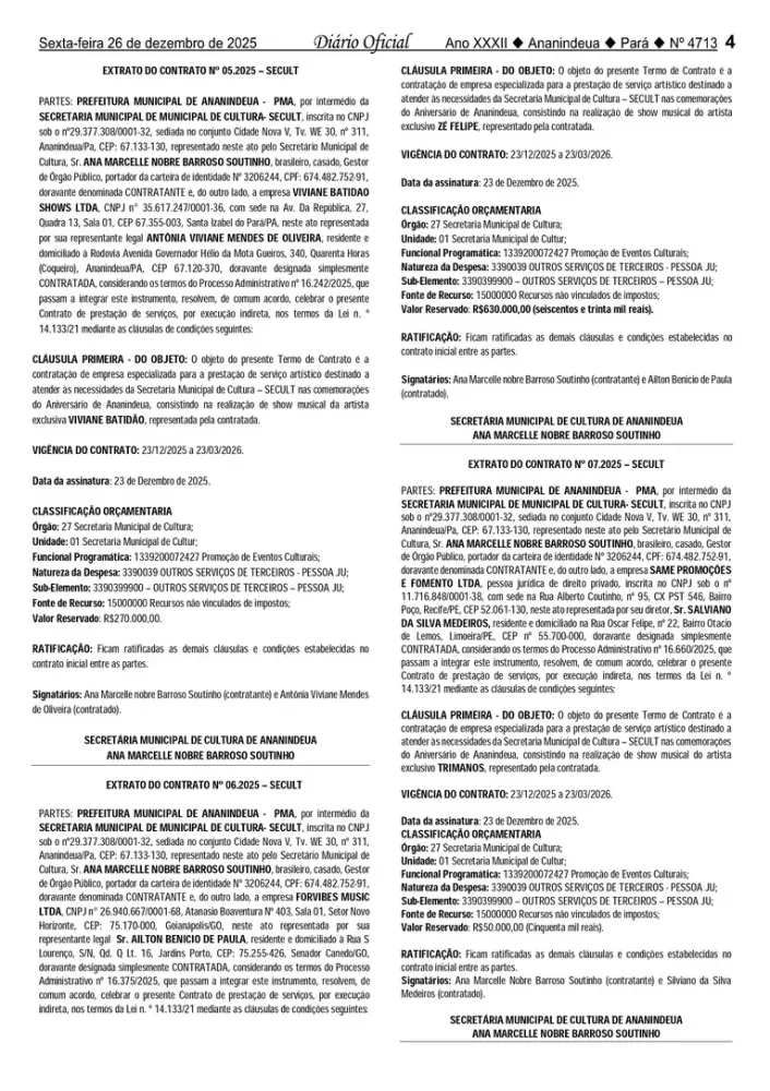A publicação de três contratos firmados pela Secretaria Municipal de Cultura (Secult) para as comemorações do aniversário de Ananindeua voltou a colocar no centro do debate a forma como os recursos públicos estão sendo aplicados no município. Os extratos, publicados no Diário Oficial do Município (edição nº 4.713), revelam que quase R$ 1 milhão será destinado à contratação de atrações musicais, valor considerado elevado diante das dificuldades enfrentadas diariamente pela população em áreas essenciais.