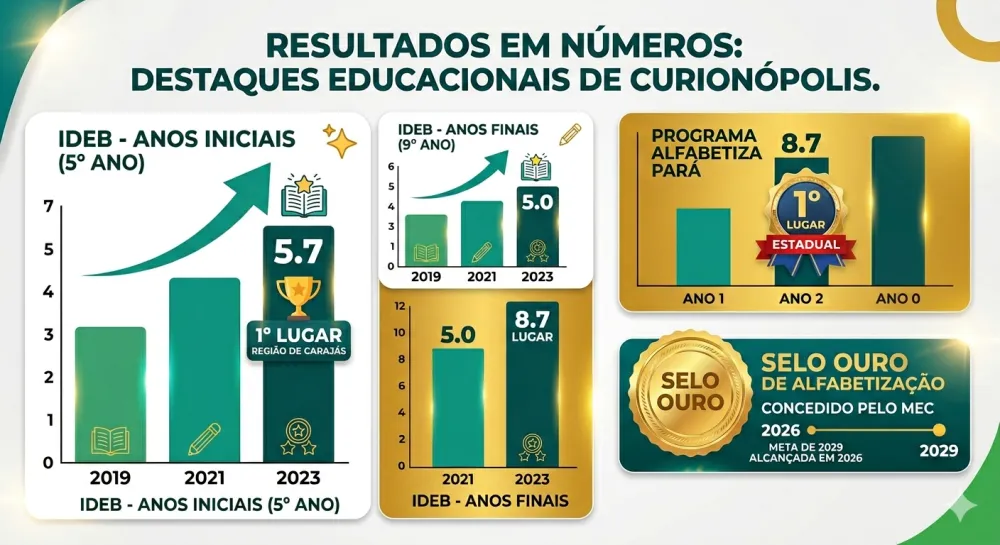 A rede municipal de ensino de Curionópolis reafirmou sua posição de destaque no cenário educacional paraense ao conquistar, pelo segundo ano consecutivo, o 1º lugar em alfabetização no estado. De acordo com dados do programa Alfabetiza Pará 2026, o município atingiu a nota 8,7, consolidando uma trajetória de crescimento consistente e resultados expressivos na educação básica.
