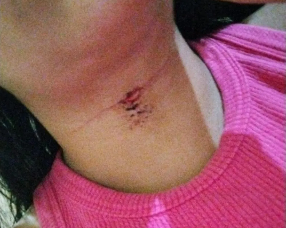 Na tentativa de resguardar o pescoço de um corte mais grave, ela soltou uma das mãos do guidão da motocicleta para se proteger e acabou perdendo o controle do veículo.