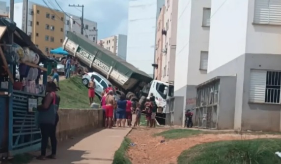 Carreta desgovernada cai em barranco e por pouco não atinge prédio do Residencial Alto Bonito