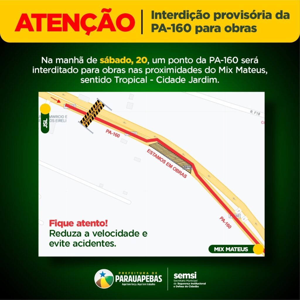 Prefeitura de Parauapebas informa sobre interdição provisória da PA-160 para obras